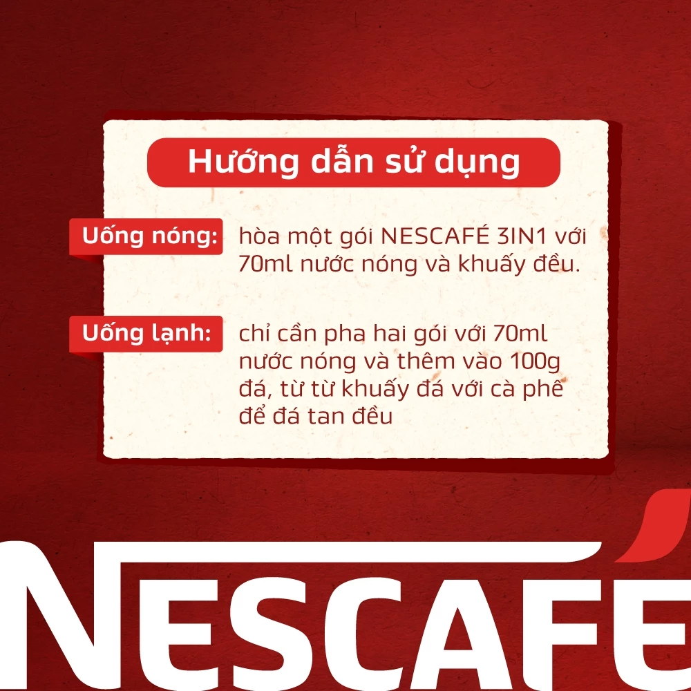 Khi uống nóng, hòa một gói NESCAFÉ 3IN1 với 70ml nước nóng và khuấy đều.